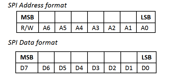 - 第一个字节包含SPI地址,后面的字节包含SPI数据。第一个字节的第一个位包含读写位,表示读取(1)或写入(0)操作。后面的7位包含寄存器地址。