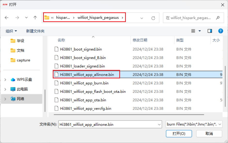 选择虚拟机的待烧录文件,在/home/username/OpenHarmony/3.0.7/out/hispark_pegasus/wifiiot_hispark_pegasus目录找到Hi3861_wifiiot_app_allinone.bin文件