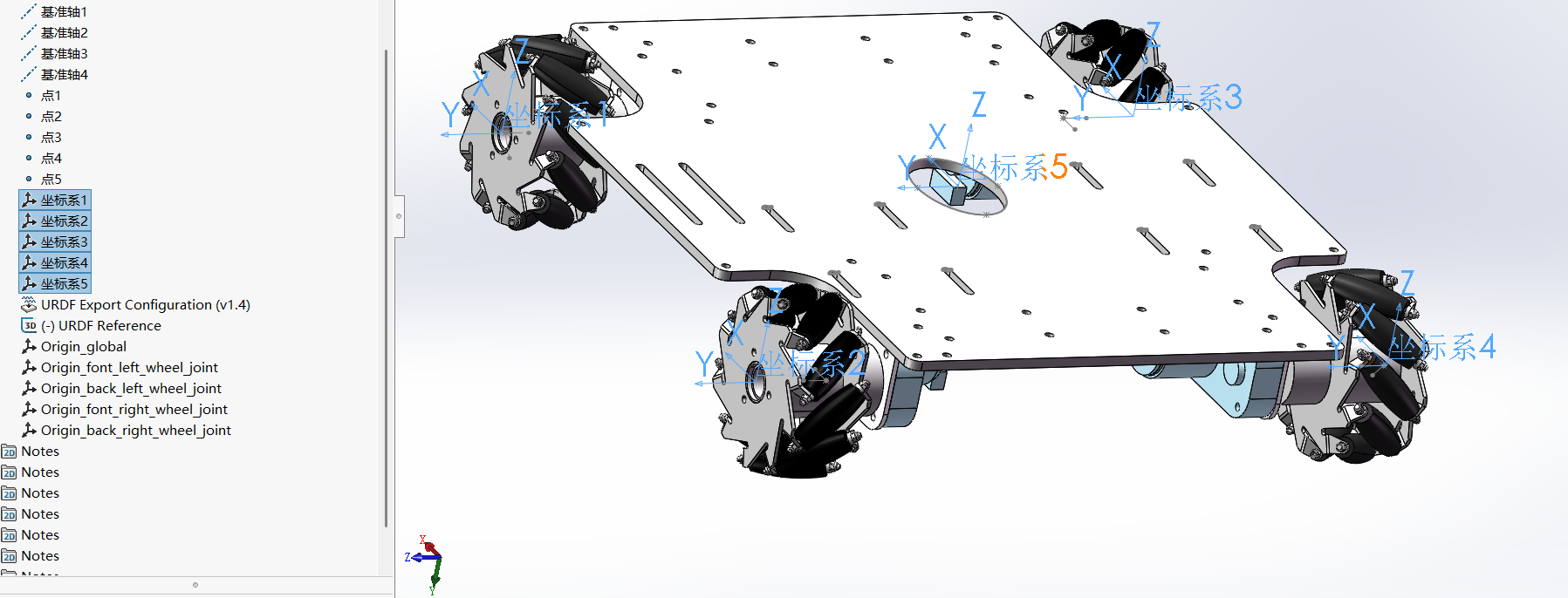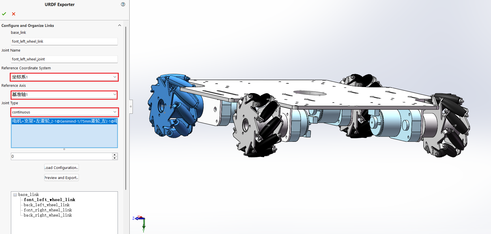以四轮底盘为例,当然这个模型并不完整,他缺少IMU、相机、激光雷达等,但导出流程都是类似的。