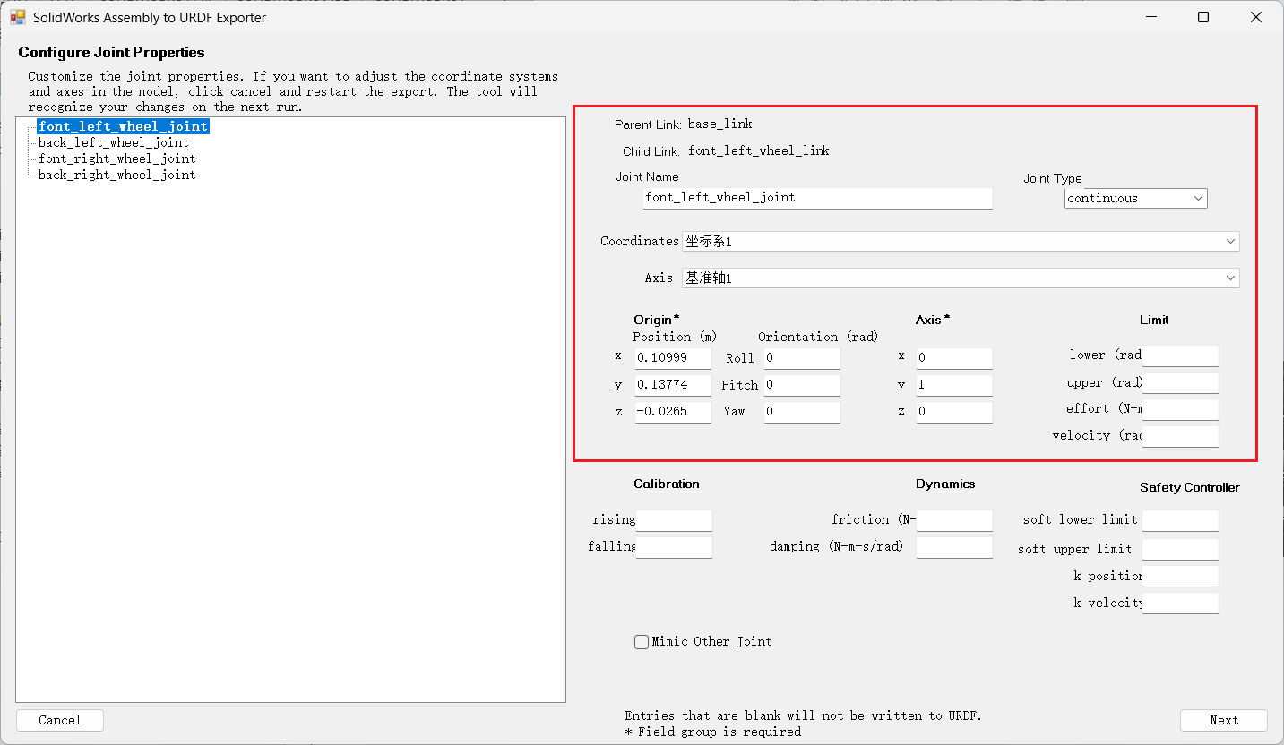 🕕确认一下坐标系、基准轴、joint类型是否正确,仿真参数不知道可以不加,点击Next。