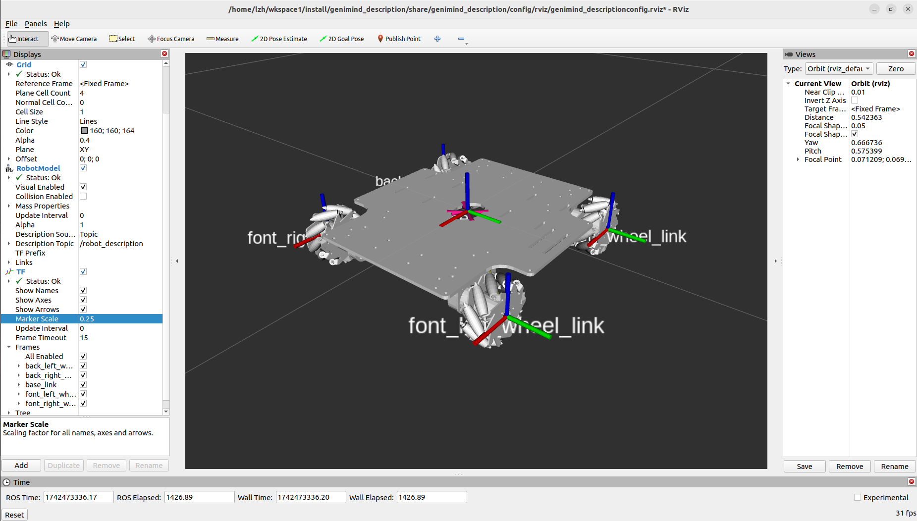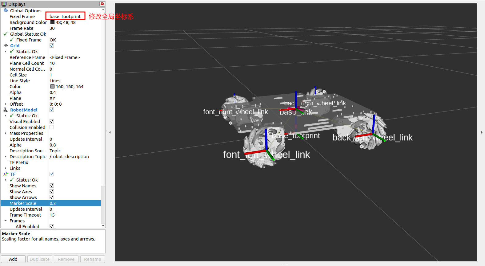 目前我们的全局坐标是base_link,因此轮子不会着地,我们添加一个虚拟link,固定到base_link的正下方,与轮子高度平齐。