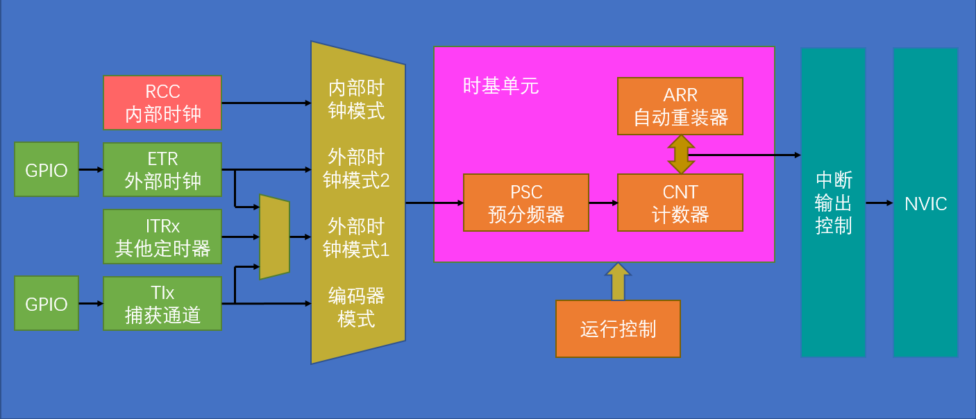 - 不仅具备基本的定时中断功能,而且还包含内外时钟源选择、输入捕获、输出比较、编码器接口、主从触发模式等多种功能